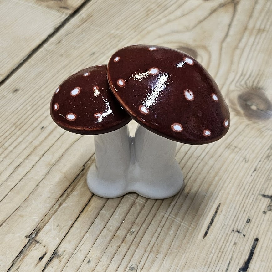 Den dobbelte fluesvamp er lavet i hvidler 25 % og er foruden den hvide glasur, glaseret med en flot dyb rød farve "Deep Firebrick", der giver svampen det helt perfekte look.