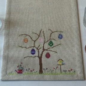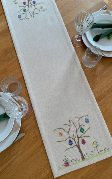 Super sød og enkel påske løber til det moderne hjem. Her broderes et træ i hver ende, hvorpå der hænger de fineste påskeæg. Der broderes også græs, blomster, et fuglehus og en vandkande.